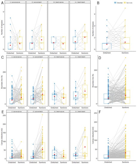 Paired boxplots of characteristics of disturbance frequency and intensity for both dendrochronological datasets for: (A) the number of releases sorted by species pairs; (B) the number of releases for all species; (C) the percent sum of boundary lines sorted by species pairs; (D) the percent sum of the boundary lines for all species; (E) the canopy area disturbed, sorted by species pairs; (F) the canopy area disturbed for all species. Blue and yellow boxes and points represent disturbed and survivor datasets, respectively. The hinges correspond to the 25th and 75th percentiles, with the thick solid line showing the median and red circles the mean values. The upper and lower whisker ends represent 1.5 ⁄ IQR of the hinge, where IQR is the inter-quartile range. Points beyond the whisker ends are regarded as outliers. Grey lines connect individual trees within the pairs.