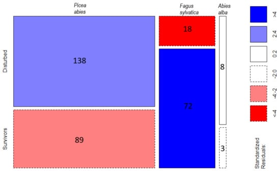 The species composition of trees killed by the storm significantly differed from the surviving community (p < 0.001, χ2 = 45.25), so we can reject the null hypothesis and confirm H3 that the Herwart storm disproportionally affected some tree species populations. P. abies and A. alba were affected significantly more than expected by chance, while F. sylvatica was disturbed only in a minority of cases compared to its population abundance (Figure 7). Generally, spruce predominated in the set of disturbed trees (84%), followed by beech (11%) and fir (5%). On the contrary, spruce represented 54% of survived individuals, followed by beech (44%) and fir (2%). The most significant contributing tree species to the Chi-square score was F. sylvatica (χ2 = 38.80).