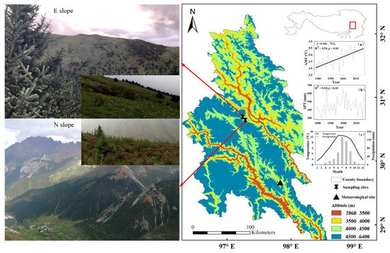 The study area was located at Langlashan mountain, Chaya County, Changdu Prefecture of the Tibet Autonomous Region, eastern Tibetan Plateau, under control by East Asian monsoon climate (30°38′ N, 97°17′ E, 4597 m asl, Figure 1). Based on the records of the nearest meteorological station in Zuogong County (29°40′ N, 97°50′ E, 3780 m asl.), annual mean temperature is 4.7 °C, with a mean temperature range from −5.1 to 13.1 °C. January and July are the coldest and warmest months, respectively. Annual precipitation is 449 mm, of which 83% fall as rain during June to September. Annual mean temperature shows a warming trend (R2 = 0.54, p < 0.01), and annual precipitation shows no apparent variation trend since 1978 (R2 = 0.03, p > 0.05, Figure 1).