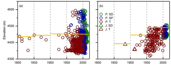 Elevation positions of Balfour spruce adult trees, juveniles, and seedlings on the north- (a) and east-facing slopes (b). Red color represents adult trees, blue color represents juveniles, and green color represents seedlings. Circles stand for Balfour spruce; triangles for junipers. P.SD stands for Balfour spruce seedlings, P.SP for Balfour spruce saplings, P.T for Balfour spruce adult trees, J.SD for juniper seedlings, J.T for juniper adult trees. Yellow lines indicate averaged treeline position.