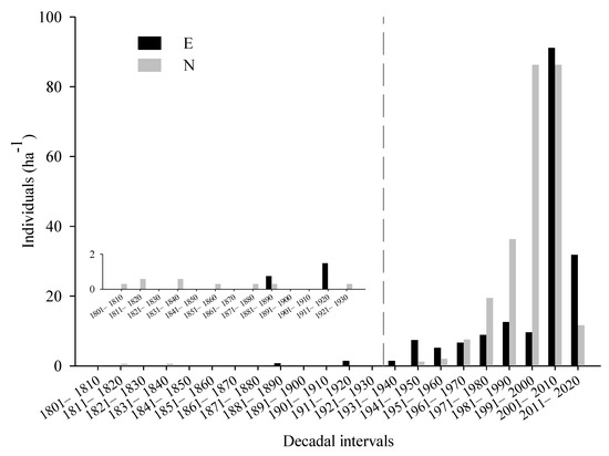 The Kolmogorov–Smirnov test showed that the patterns of tree recruitment on the two slopes were insignificantly different (p > 0.05, Figure 3). Tree recruitment showed a continuous increase from 1961 to 2010 on the north-facing slope, especially pronounced from the 1980s on, accounting for 80% of the total recruits (Figure 3). However, tree recruitment showed an abrupt increase from 1941 to 1950 on the east-facing slope, then maintained a constant rate until 2000, followed by a second increase pulse during the period 2001–2010 (Figure 3).