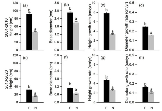 Height (a,e), base diameter (b,f), height growth rate (c,g), and diameter growth rate (d,h) of Balfour spruce during 2001–2010 (upper panels) and 2010–2020 (bottom panels) on the north- and east-facing slopes. Different letters indicate significant differences at p < 0.05.