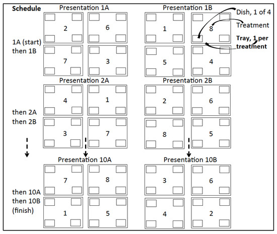 The weather was mild during the trial, which was undertaken throughout a single day until all replicates were presented. Treatments were randomly allocated in groups of four, such that the eight treatments were offered with every two successive presentations (Figure 1). This was to ensure that kangaroos were not overwhelmed by the presentation of all treatments at once. The eight treatments were numbered 1 to 8; then, their order was repeatedly randomised in fours for each pair of presentations. This was continued until (4 × 2) × 10 presentations were offered with ten random replicates per treatment. A black plastic tray (30 × 40 cm) with small plastic dishes with pellets in each of the corners (diameter 12 cm) was used per treatment. These were spaced sufficiently far apart (2 m) to allow kangaroos to consciously select between the four treatments and restrict the aroma of neighbouring pellets interfering in the selection process. Normal feeding regimes were maintained, and care was taken to keep human disturbance to a minimum.