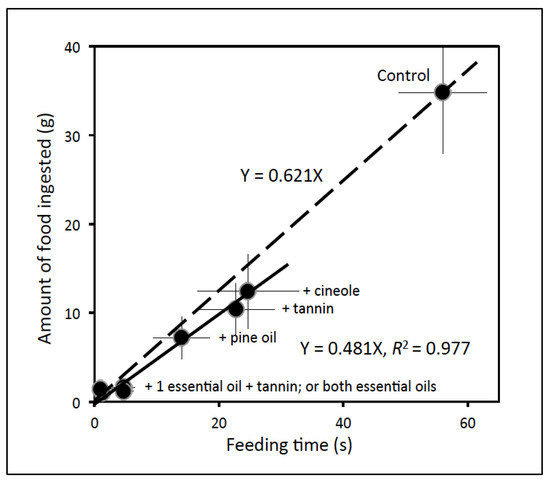 The two-way analysis of variance showed highly significant tannin (p < 0.001) and essential oil (p < 0.001) effects, with no interaction (Table 1). The amount consumed was well correlated with the time spent feeding per visit (R2 = 0.976, Figure 2). However, kangaroos took longer to consume pellets containing tannins and/or essential oils. Time spent feeding on the control group was 1.5–2.7 times longer than any of the single-metabolite-added treatments, but the rate of consumption (seconds/gram) was 1.9–2.1 times slower. When individual essential oils were combined with tannin, time spent feeding was 5.5–13.0% of the control. The rate of consumption of the pine oil treatment in the presence of tannin was particularly slow (2.9–3.8 times slower rate than the control).