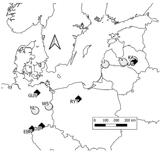 An international provenance experiment established under the collaboration of the German Democratic Republic and the USSR in 1975 for assessment of performance of Scots pine metapopulations from Eastern Europe and the USSR [54] was studied. The seed material for the experiment was collected in 36 open-pollinated stands (20–25 plus trees per stand) distributed in 50–57° N and 11–27° E (Baltics, Ukraine, Belarus, Poland, and Germany) [54,55]. Such region currently comprises climates projected for the Baltic States (Latvia) by the end of the 21st century [1,56]. Five parallel trials (Figure 1) growing under lowland (≤220 m above sea level) conditions near Liepaja (LI), Zvirgzde (ZV), Kalsnava (KA), Waldsieversdorf (WS), and Nedlitz (NL) on freely drained oligotrophic mineral (sandy or silty) podzols (LI, ZV, and KA) or mesotrophic sandy brown soil (WS and NL) with a flat topography (Table 1) were sampled. Thus, the trials represented regional climatic gradient and projected amplitude of its shift by the end of the 21st century [1,56].