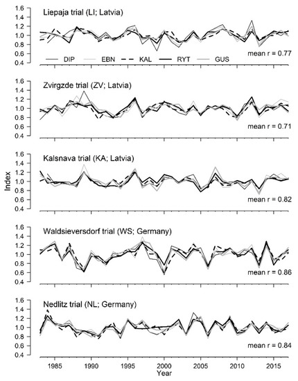 Residual chronologies of tree-ring width of the studied provenances of Scots pine according to trial. The mean interseries correlation between the chronologies by trial are indicated in the panels (mean r).