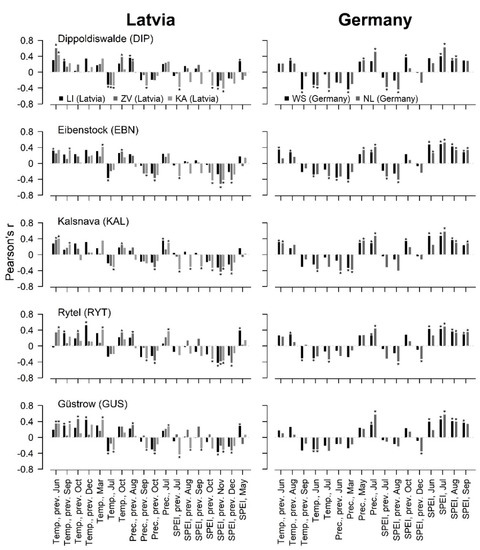 Among the meteorological variables showing common correlations with chronologies in Latvia and Germany, July precipitation and temperature in the previous June showed positive effects, while temperature in July and SPEI in the previous July, August, and December showed negative effects (Figure 3). The correlations with temperature in the previous September were contrasting. Correlations with temperature during the dormancy period (December and March) and precipitation in the previous vegetation period (August–October), as well as SPEI in May were specific to trials in Latvia. In Germany, provenances showed correlations with precipitation in March and May, June–September’s SPEI, and temperatures in June and the previous August.