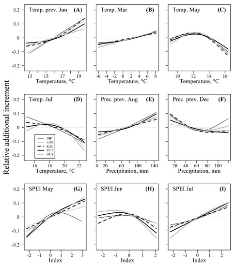The estimated regional drivers of radial increment (Table 4) were similar to meteorological variables identified by the local weather–growth relationships (Figure 3). Regarding the top-performing provenance (RYT and GUS), the strongest effects (highest F-values) were estimated for SPEI in May and July (Table 4). Temperature and SPEI in May had the strongest effect on KAL. The low-performing provenances were most affected by temperature in the previous June, as well as precipitation in the previous August (DIP), and May’s temperature (EBN). The majority of the response curves were nonlinear (quadratic; Figure 4), confirming the dependence of weather–growth relationships on the intensity of variables.