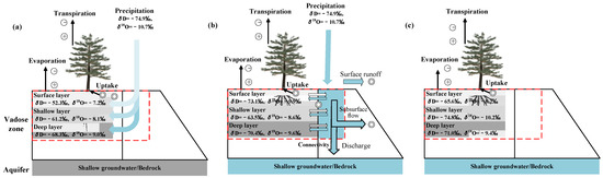 Conceptual diagram of ecohydrological processes affecting the isotopic composition of soil water, (a) at the initial phase of precipitation event, (b) at the phase of runoff and (c) after precipitation event. Plus indicates an isotopic fractionation process with enrichment in heavy isotopes; minus represents the opposite process; and zero is a sign of nonfractionating processes.