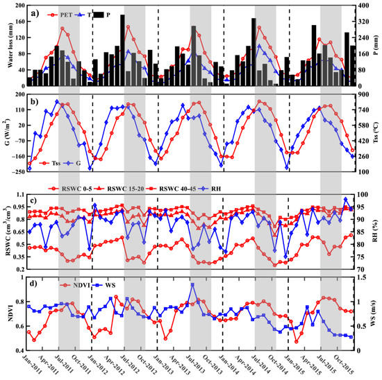 Temporal variation in (a) water loss, including potential evapotranspiration (PET) and transpiration (T) and precipitation (P); (b) cumulative soil temperature (Tss) and heat flux (G); (c) relative soil water content at 0–5 cm depths (RSWC 0–5), 15–20 cm depths (RSWC 15–20) and 40–45 cm depths (RSWC 40–45) and relative humidity (RH); (d) NDVI and wind speed (WS). Shadow areas indicate seasonal drought periods (July–October).