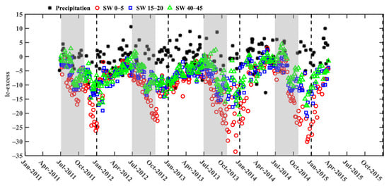Temporal variation in lc-excess of sampling soil water when there was no rain on the same day at 0–5 cm depths (SW 0–5), 15–20 cm depths (SW 15–20) and 40–45 cm depths (SW 40–45) and precipitation. Shadow areas indicate the seasonal drought periods (July–October).