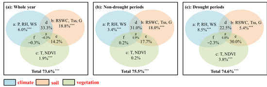 Redundancy analysis explained 73.6% (Figure 5a), 75.5% (Figure 5b) and 74.6% (Figure 5c) of variability in soil water lc-excess during a whole year and non-drought and drought periods, respectively. The positive interaction effects between climate variables, including P, RH and WS and soil variables including RSWC, Tss and G explained mainly variability in soil water lc-excess, followed by the effects of soil variables during a whole year and non-drought periods. During drought periods, the positive interaction effects between soil and vegetation variables explained the largest fraction of variability in soil water lc-excess, followed by the interaction effects between climate and soil variables.