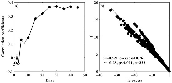(a) Variation in correlation coefficients between soil evaporation loss fraction (f) at 0–5 cm depth and the ratio of potential evapotranspiration to precipitation (PET/P) over different days prior to the sampling day and x = 0 represents the sampling day and (b) the relationship between f and soil water lc-excess at 0–5 cm depth when there was no rain on the same day. Open symbols indicate non-significant correlations and solid ones indicate significant correlations at p < 0.05 level.
