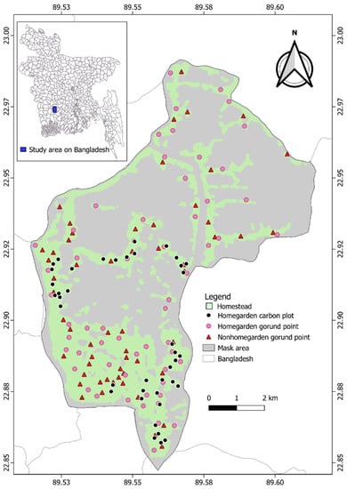 A multi-stage random sampling procedure was followed to select homegardens. First, two unions (smallest administrative unit), namely Senhati and Barakpur, from the total of six unions of Dighalia Upazila were selected randomly. Then, eight villages were selected randomly from the two randomly selected unions (four villages from each union). A total of 40 plots of 10 × 10 m (five from each randomly selected village) were taken purposively (homestead with homegarden), as shown in Figure 1. We measured the diameter at breast height (DBH) and canopy height of all species with a DBH ≥ 3 cm. All species in each sampled plot were identified and recorded to species level or by local name and were later confirmed from an authentic source []. We collected soil samples for soil organic carbon assessment from the center of each plot. We pulled out soil cores using an open face peat augur. From the soil core, we took a total of 80 (40 homegardens × 1–plot × 2 depths) soil samples; two from each plot using a five-centimeter-long steel core at the midpoint of 0–15 cm depth and 15–30 cm depth. All samples were air-dried and analyzed for estimating bulk density and soil organic carbon. We analyzed all the soil samples at the Nutrient Dynamics Laboratory of Khulna University, Bangladesh.