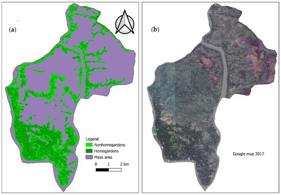 Extent of homegardens and non-homegardens in Dighalia Upazila. (a) Based on unsupervised classification of Sentinel 2 imagery; (b) Google Earth satellite image® shows homegardens covered by dark area.