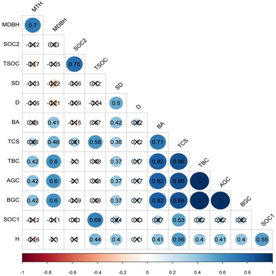 Correlation matrix between stand structure, diversity and different carbon pools. Block with cross sign indicates insignificant relation (p > 0.05). MDBH: Mean Diameter at Breast Height (1.37 m), MTH: Mean tree height, SD: Stem Density, BA: Basal Area, D = Margalef Diversity index, H = Shannon Diversity Index, AGC: Aboveground Carbon, BGC: Belowground Carbon, SOC1 = Soil Organic Carbon at 0–15 cm depth, SOC2 = Soil Organic Carbon at 15–30 cm, TBC = Total Biomass Carbon (AGC + BGC), TSOC = Total Soil Organic Carbon (0–30 cm).