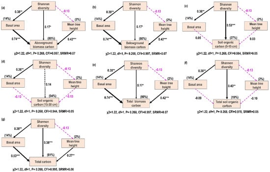 Structural equation models. (a–g) Aboveground biomass carbon (a), belowground biomass carbon (b), soil organic carbon (0–15 cm) (c), soil organic carbon (15–30 cm) (d), total biomass carbon (e), total soil organic carbon (f) and total carbon (g). All SEMs had a similar insignificant χ2 (Chi-Square) of 1.22 (p = 0.268), with a comparative fit index close to one (CFI; 0.98–0.99) and a standardized root mean square residual close to zero (0.08), indicating no significant deviation from model and datasets at one degree of freedom. The lines with pink and black indicate a negative and positive association between the two covariables. Arrows with numbers indicate the standardized association of predictors with dependent variables. Numbers with percentages above boxes independent variables indicate their explained variance (Coefficient of determinant: R squared) by all the predictors. The path values with asterisks indicate their significance level (*** p < 0.001, ** p < 0.01, * p < 0.05), while the insignificant paths were indicated as dotted lines (p > 0.05).