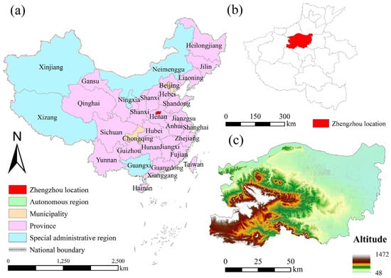 Geographic location (a), administrative district (b), and topography (c) of Zhengzhou region.