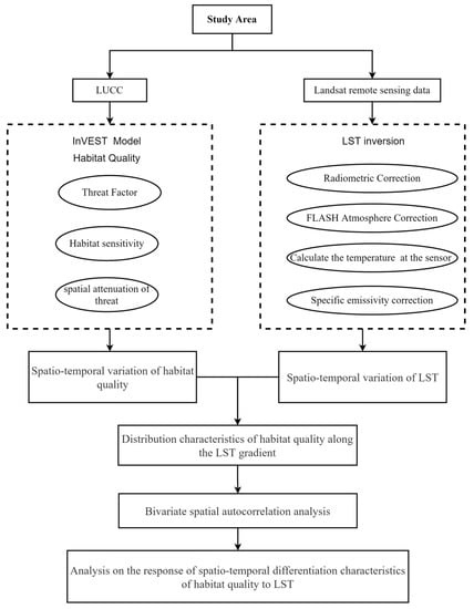 The workflow steps in our analysis are shown in Figure 2. The principle of the InVEST-Habitat Quality model is to combine land-use and land-cover change (LUCC) and threat factors to generate a habitat quality map to reflect the status of regional biodiversity. The interpretation data of land use and cover in 2000, 2005, 2010, and 2015 required to calculate habitat quality are all sourced from the Data Center for Resources and Environmental Sciences, Chinese Academy of Sciences (RESDC) [38,39]. The grid resolution is 30 m × 30 m. The Landsat series of remote sensing images required to retrieve LST are provided by the United States Geological Survey (https://earthexplorer.usgs.gov/, accessed on 6 January 2021). To maintain consistency of the data source, images of the same month are selected to minimize the effects of seasonal variation in solar radiation. The dates of the selected images are 8 June 2000 (Landsat 7), 22 June 2005 (Landsat 7), 20 June 2010 (Landsat 7), and 10 June 2015 (Landsat 8). To reduce the difference in topography, illumination, and atmosphere of different time phase images, radiation correction and atmospheric correction were carried out on the four phase images, and the data processing was carried out in ArcGIS 10.2 and ENVI 5.3.