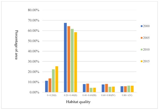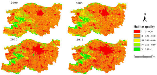 Using the isometric classification method of ArcGIS, the calculation results of habitat quality index were divided into five intervals: 0.00–0.20, 0.20–0.40, 0.40–0.60, 0.60–0.80, and 0.80–1, which represent I, II, III, IV, and V (from low to high), respectively. The differences in habitat quality and the evolution law of spatio-temporal pattern in Zhengzhou were further analyzed (Figure 3 and Figure 4).