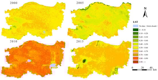 To eliminate the influence of dimension and magnitude on the final result, this study uses the range standardization method to process the LST results of Zhengzhou; the value range was (0, 1). Using ArcGIS’s equal interval classification method, LST was divided into 10 gradients from low to high (Figure 5). In terms of time scale, LST dropped slightly from 2000 to 2005, rose markedly in 2010, and dropped slightly in 2015. The results show that in different stages of Zhengzhou’s transformation from traditional industry and agriculture to modern service industry, its overall LST is in a dynamic change process.