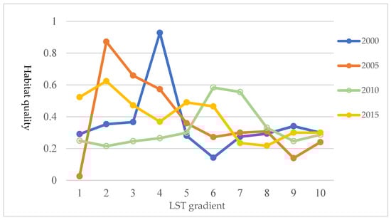 Distribution of habitat quality along LST gradients during the different periods from 2000 to 2015.