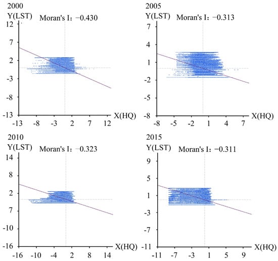 Using GeoDa software, the bivariate spatial autocorrelation analysis was carried out with LST as the first variable (X) and habitat quality (HQ) as the second variable (Y). Corresponding to different periods in 2000, 2005, 2010 and 2015, the global Moran’s I were −0.430, −0.313, −0.323, and −0.311, respectively (Figure 7). Randomization 999 was selected in GeoDa for the significance test. The results showed that the p values were all 0.001, indicating a significant spatial negative correlation between LST and habitat quality under the confidence of 99.9%; that is, with the increase in LST, habitat quality in Zhengzhou showed a downward trend.