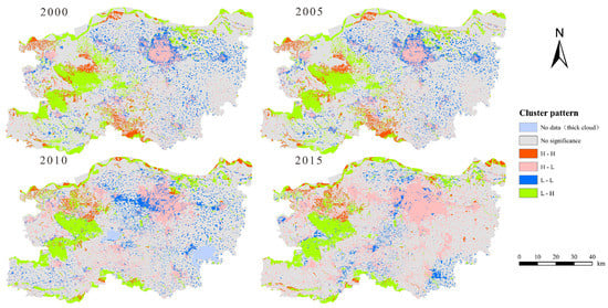The H-H type was scattered mainly in the western and northern regions of the study area, showing a significant reduction trend from 2000 to 2015, indicating that the rise of a certain LST in some areas in the initial stage can promote the flow of energy and materials in the habitat, but the continuous high LST straightforwardly led to different degrees of structural confusion, dysfunction, and other degradation trends in different habitats. The H-L type was mainly distributed in densely populated and actively built central urban areas, showing a continuous expansion trend, indicating that suburbanization of residential areas is bound to be accompanied by suburban urbanization. The gradual diffusion of manufacturing and industrial agglomeration centers from central urban areas to suburbs is the main reason for the rise of LST. The excessive LST destroys the structure and function of the original habitat. This has resulted in the decline of habitat quality.