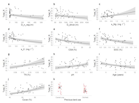 Relationships between Total_R and explanatory and response variables identified by the best fit model. Black lines are the fitted lines calculated using the ggpredict function in R, providing the predicted values on the scale of the response. The shaded area represents the 95% confidence interval. Points represent measured values (N = 43). (a) D_n_veg = distance to natural vegetation (m); (b) D_shrub = distance to shrub patches (m); (c) s_Mg = soluble Mg (mg L−1); (d) s_K = soluble K (mg L−1); (e) CSilt = coarse silt fraction (0.05–0.02 mm, %); (f) SOC = soil organic carbon (%); (g) TN = soil total nitrogen (%); (h) pH; (i) Age = afforestation age (years); (j) Cover = plant cover (%); (k) land use prior to afforestation.