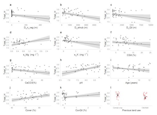 Relationship between Total_H and explanatory and response variables identified by the best fit model. Black lines are the fitted lines calculated using the ggpredict function in R, providing the predicted values on the scale of the response. The shaded area represents the 95% confidence interval. Points represent measured values (N = 43). (a) D_n_veg = distance to natural vegetation (m); (b) D_shrub = distance to shrub patches (m); (c) D_Qil = distance to Quercus woodland (m); (d) s_Mg = soluble Mg (mg L−1); (e) s_K = soluble K (mg L−1); (f) CSilt = coarse silt fraction (0.05–0.02 mm, %); (g) CaCO3 (%); (h) pH; (i) Age = afforestation age (years); (j) Cover = plant cover (%); (k) CovQil = Quercus ilex cover (%); (l) land use prior to afforestation.