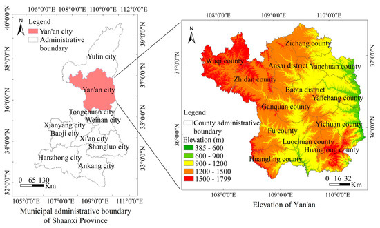 Location of the study region. Including the municipal administrative boundary of Shaanxi Province (left), and the elevation of Yan’an (right).