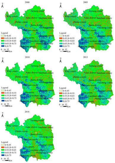 After rasterized and standardized indexes of LES evaluation were obtained, a grid map of LES in Yan’an in 2000, 2005, 2010, 2015, and 2018 is generated, according to the weight of each index.