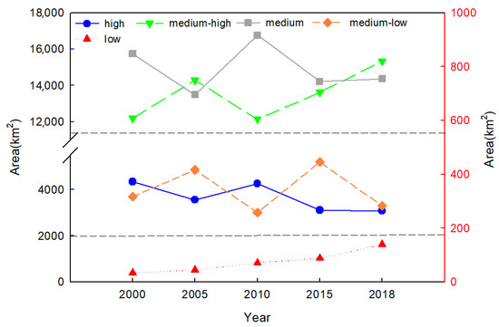 The area of the zone in different LES levels from 2000 to 2018: high, medium−high, medium, medium−low, and low levels. The right Y-axis represents the area variation of the low level of LES, the left Y-axis represents the area variation of the other four levels of LES.