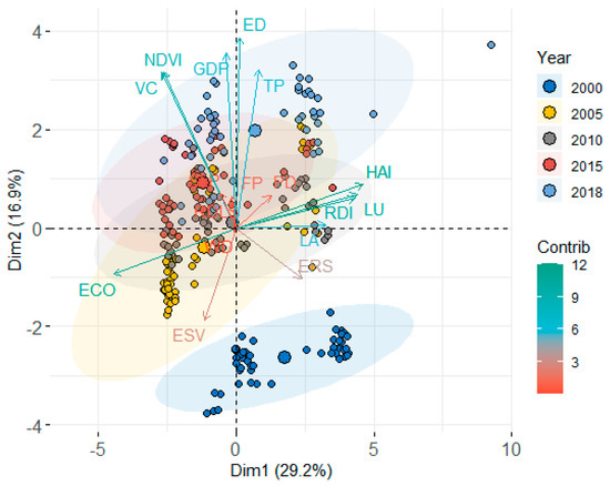 Principal component analysis of land ecological security in Yan’an from 2000 to 2018. Contrib. represents contribution rate of each factor to LES; LES represents land ecological security; TP represents land surface temperature; VC represents vegetation coverage; NDVI represents normalized differential vegetation index; ERS represents soil erosion; ESV represents the value of the ecosystem service; HAI represents human disturbance index; SLP represents slope; RDLS represents topographic relief; ECO represents the elasticity of ecological environment; BZ represents buffer zone; RDI represents regional development index; ED represents economic density; GDP represents gross domestic product; LU represents the degree of land use; LA represents arable land per capita; WD represents water coverage; PD represents the density of the population; FP, grain yield.