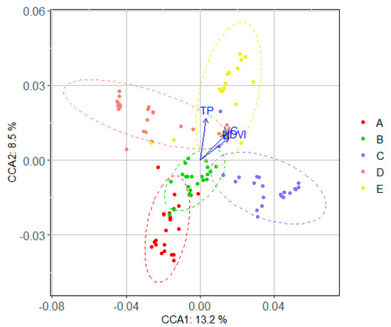 Canonical correspondence analysis of LES in Yan’an from 2000 to 2018. A, B, C, D, E represents the years 2000, 2005, 2010, 2015, and 2018, respectively. NDVI represents normalized differential vegetation index; VC represents vegetation coverage; TP represents land surface temperature.