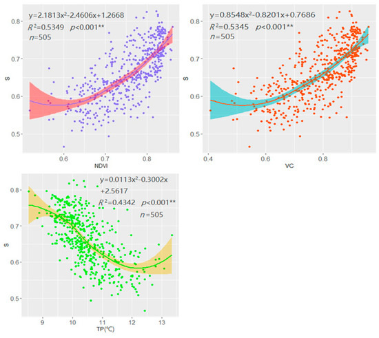 Relationship between NDVI, VC, TP, and S with 95% CI. ** represents a significant correlation at 0.01 level (bilateral). S represents ecological security index; LES represents land ecological security; NDVI represents normalized differential vegetation index; VC represents vegetation coverage; TP represents land surface temperature; CI represents confidence interval. Shaded areas represent 95% confidence intervals.