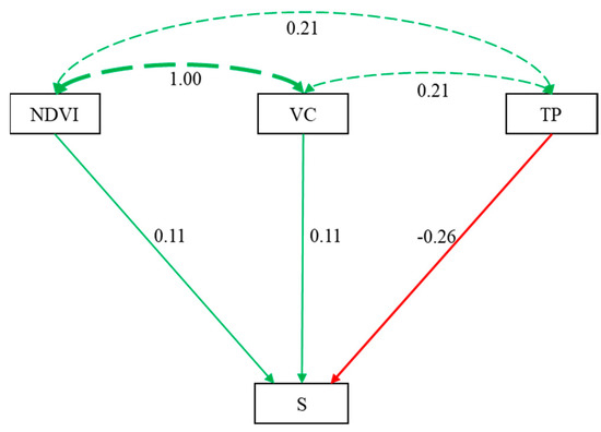 Path analysis between NDVI, VC, TP, and S of LES. The numerical value represents path coefficient; S represents ecological security index; LES represents land ecological security; NDVI represents normalized differential vegetation index; VC represents vegetation coverage; TP represents land surface temperature.