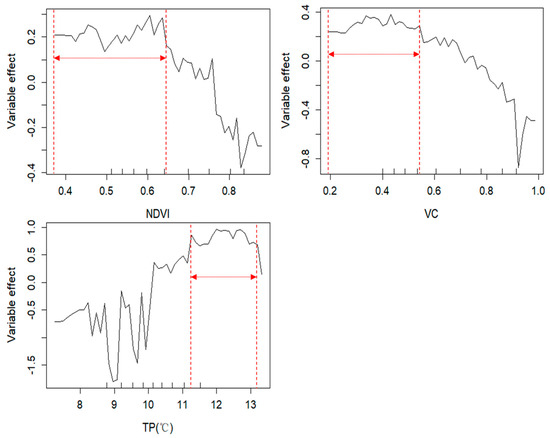 Influences of NDVI, VC, and TP on advanced LES status (high level and medium−high level) based on the random forest model. LES represents land ecological security; NDVI represents normalized differential vegetation index; VC represents vegetation coverage; TP represents land surface temperature. The value between the red dotted lines represents the optimal threshold range of NDVI, VC, and TP required by the advanced LES status.