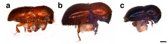Collection of wood-boring insects from random insect traps in the Acacia mangium plantation in Pahang. (a) Xyleborus affinis, (b) Xylosandrus crassiusculus, and (c) Hypothenemus sp. [scale bar = 300 μm].