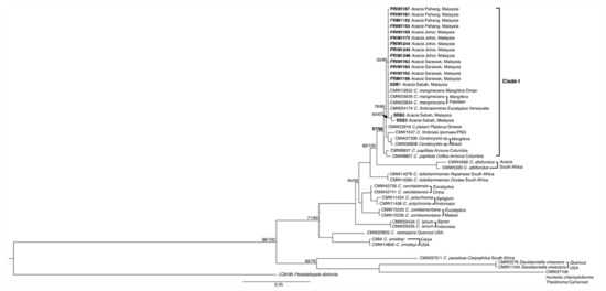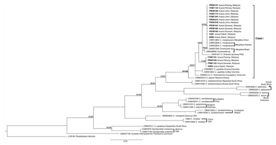 We acknowledge the director general of Forest Research Institute Malaysia and the director of the Forest Biodiversity Division for their continuous support. The assistance rendered from members of the Mycology and Pathology Laboratory (Anida, Atikah, Fakhruddin, Fariza, Jamaluddin, Kamarul, and Salleh) and Sarawak Forestry Department (Annya, Hamzah, Kamal, Lelawati, Marfaizal, Princilla) throughout this research, especially the surveys and collection of diseased samples are highly appreciated. The authors also thanks Yani Japarudin of the Sabah Softwood Ltd. for contributing the Ceratocystis isolates.