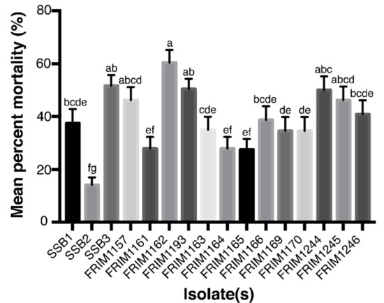 The FRIM1162 isolate was confirmed as the most aggressive isolate against A. mangium seedlings. This isolated strain was obtained from a seven-year-old A. mangium tree in the Pahang plantation. The mean percentage of mortality after 35 days of inoculation with this fungal isolate was 60.42 ± 4.84%. Meanwhile, the second aggressive isolate was SSB3 that was isolated from Sabah (51.67 ± 4.04%). The least aggressive, SSB2 (14.17 ± 2.87%), was also isolated from Sabah. The analysis of variance (ANOVA) in the pathogenicity test (F = 19.98 at p < 0.05) also confirmed that all the fungal isolates differed significantly (Figure 5). Re-isolation of fungi strains from the diseased stems of all the inoculated seedlings successfully recovered the fungal pathogens. In contrast, none of the control seedlings yielded the fungal pathogens.