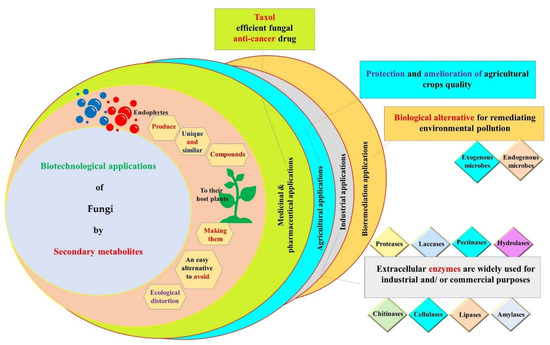 The trend of using biological (herbal and microbial) drugs encouraged the scientific community to prospect the natural products synthesized by endophytic fungi [65,66]. These endophytes produce unique compounds and also compounds similar to those produced by their host plants making them an easy alternative to plants to avoid ecological distortion [67]. The produced compounds may be directly or indirectly applied in several biotechnological fields such as medicine, pharmacy, agriculture, bioremediation and industry. Some of these natural products are discussed along with their functions in the following sections [9,68] (Figure 2).