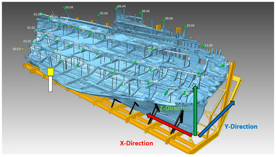 As discussed, large archaeological wooden structures, such as the Mary Rose, are complex to monitor and understand. While shrinkage in the direction of the growth ring is generally limited to 7–8% in recent wood, it can be around 60% in deteriorated archaeological wood [19]. This is compounded by the difference in drying shrinkage associated with different species and orientations, and it is complicated to assess the health of large wooden structures and predict changes in their structural integrity. It is, however, possible to measure the displacement and distortion of these large wooden structures in real time during drying to better understand the drying process. The monitoring should also alert the conservator to any major changes that need swift intervention. Non-contact geodetic measurements, such as theodolites, photogrammetry and terrestrial laser scanners, have all been used extensively in cultural heritage [20,21,22]. Many constraints limit the scanning systems that can be used to obtain the three-dimensional coordinates of the structure in question. These include the size and shape of the object, the surface material of the object (e.g., reflectance) and the cost, ease of use, etc. [23].