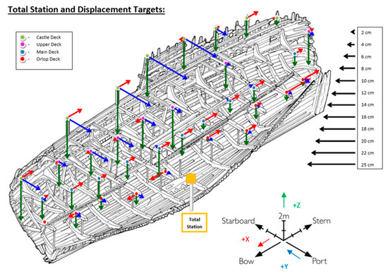 Comparisons across the four decks in Figure 5 show that the total displacement in the Z direction increased in each higher deck. The average displacement in the Z direction in the orlop deck was −40 ± 20 mm, in the main deck it was −90 ± 30 mm, in the upper deck it was −150 ± 30 mm and in the castle deck it was −190 ± 50 mm. The greatest total displacement of 260 mm occurred in the castle deck. This means that the 05.04 target, which is around halfway along the castle deck of the ship (c.f., Figure 2), has displaced more than any other target in the Z direction.