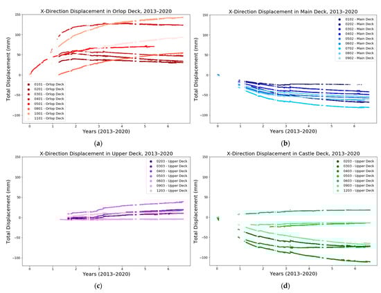 X direction displacement of the TS targets in the (a) orlop, (b) main, (c) upper and (d) castle decks plotted against time for the period between September 2013 and March 2020.
