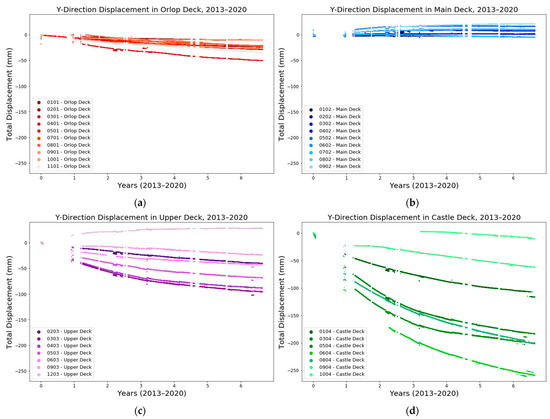 Y direction displacement of the TS targets in the (a) orlop, (b) main, (c) upper and (d) castle decks plotted against time for the period between September 2013 and March 2020.