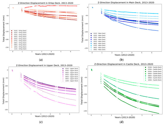 Z direction displacement of the TS targets in the (a) orlop, (b) main, (c) upper and (d) castle decks plotted against time for the period between September 2013 and March 2020.