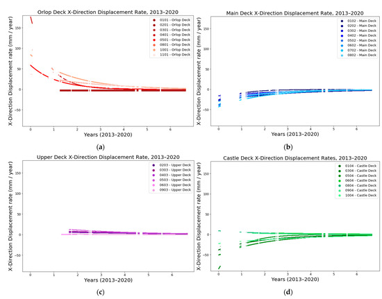 Rate of the X displacement of the TS targets in the (a) orlop, (b) main, (c) upper and (d) castle decks plotted against time for the period between September 2013 and March 2020.
