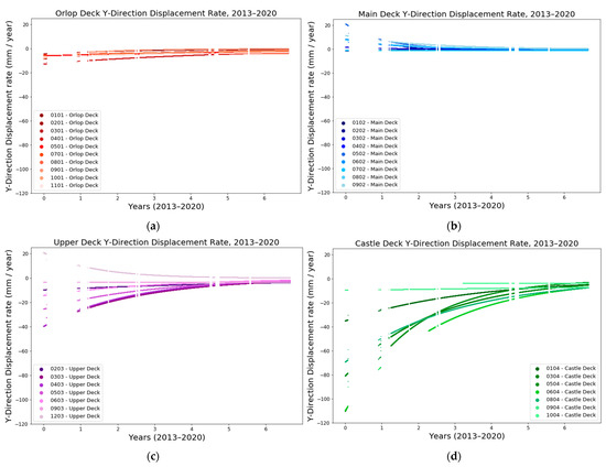 Rate of the Y displacement of the TS targets in the (a) orlop, (b) main, (c) upper and (d) castle decks plotted against time for the period between September 2013 and March 2020.
