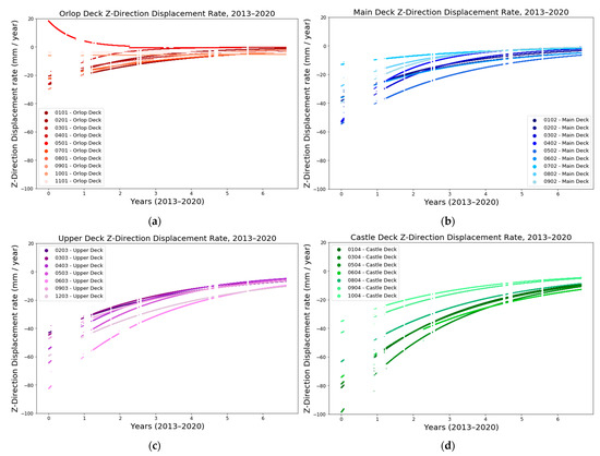 Rate of the Z displacement of the TS targets in the (a) orlop, (b) main, (c) upper and (d) castle decks plotted against time for the period between September 2013 and March 2020.